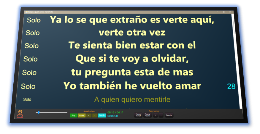 Sincroniza cada palabra con la música. El editor te permite ajustar los tiempos y resaltar las líneas que desees. El visor, personalizable, te da la opción de mostrar la letra en líneas o párrafos, y enviarlo a un monitor externo.